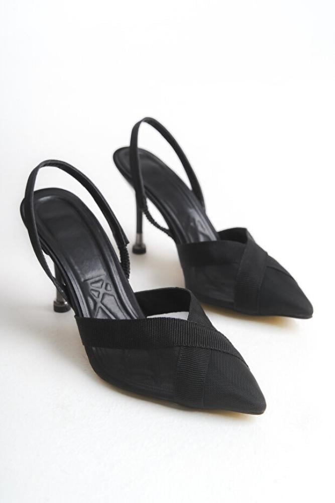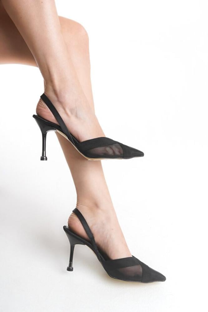 - الاسم: حذاء أسود بتفاصيل شبكية ومقدمة مدببة وكعب رفيع
